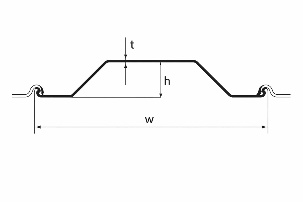 | Section | Width (mm) | Height (mm) | Thickness (mm) | Weight (kg/m) | Inertia (cm⁴/m) | Section Modulus (cm³/m) |